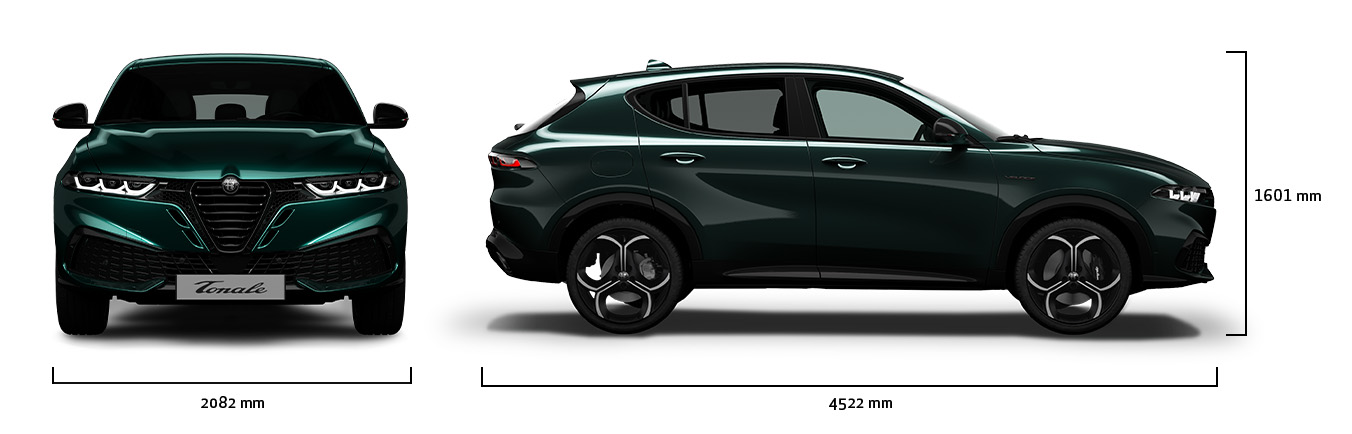 Mere vozila Alfa Romeo Tonale znašajo 4.522 mm v dolžino, 1.601 mm v višino in 2.082 mm v širino z ogledali (1.937 mm z zloženimi) – združujejo prepoznavno italijansko oblikovanje in sodoben slog znamke Alfa Romeo. Izbirate lahko med aluminijastimi platišči velikosti od 43,18 cm (17-palčna) do 50,8 cm (20-palčna). Prtljažnik ponuja do 500 litrov prostornine, ki se ob zloženih zadnjih sedežih poveča na 1.500 litrov.